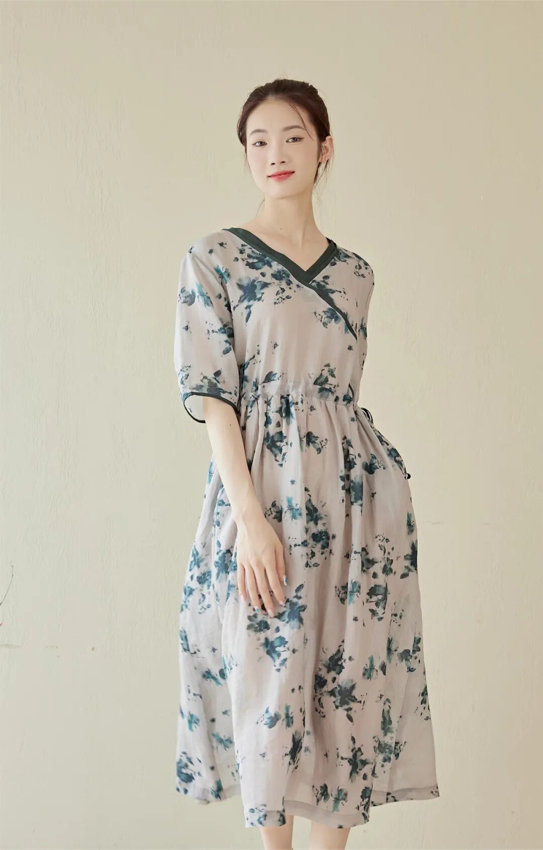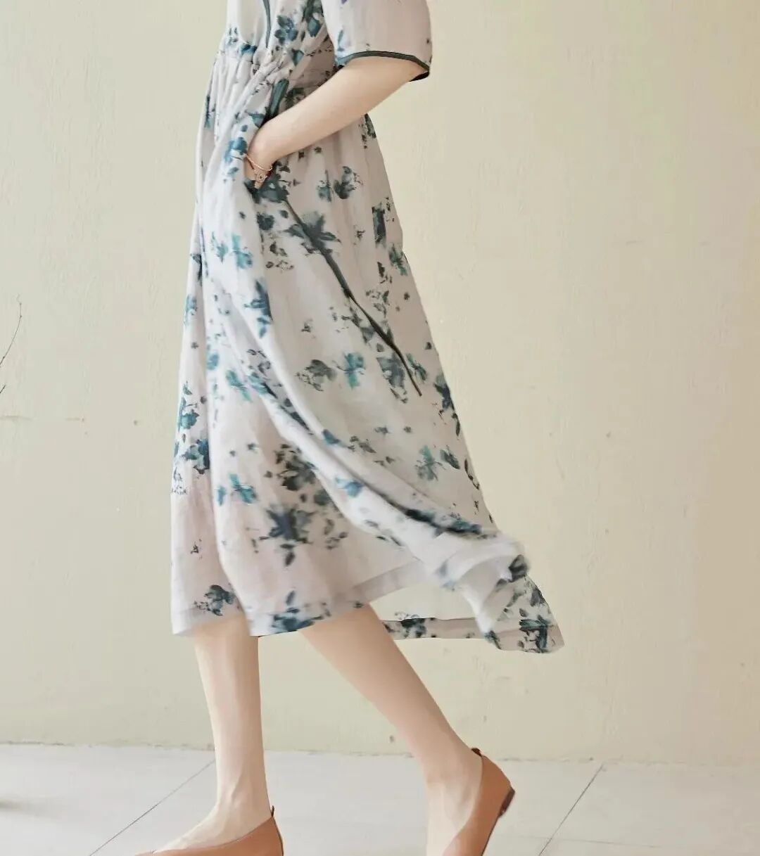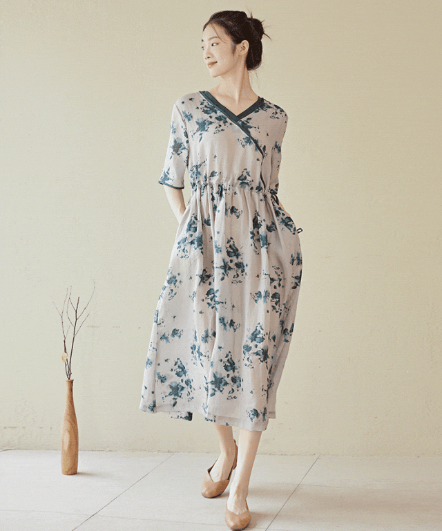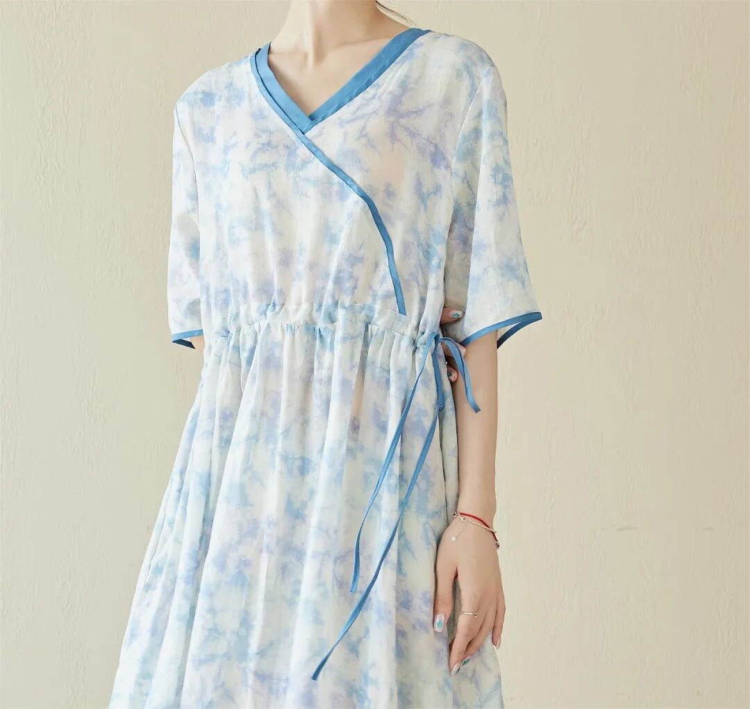 麻水墨扎染质感的印花亮眼独特,植物花卉充满生机,宽松藏肉,自在凉爽,印花清新雅致,摆脱了基础款的单调感。长短适中版型宽松,似绽于一片清风之中,夏天穿会刚刚好。腰间的抽绳设计,略高的位置,搭配较宽的裙摆,能瞬间提高腰线,优化身材比例,显高、显腿长细看抽绳,你会发现它是同材质撞色的,线迹细腻平整,质感高级。裙长到小腿中部,日常活动不易走光,优雅不压身高,还能挡太阳,不怕腿晒黑。V领斜襟的上半身,拼接同色系撞色为整体增加了线条感,能中和印花复杂的视觉感受,看起来更利落一些,整体做工也会偏复杂一些。会显得脖子的线条更加纤细优雅,也会显得更加轻盈、凉快宽松的中袖,能藏住拜拜肉,也增加了一丝温婉的气质,裙子两侧还配有口袋,方便你随身携带一些常用小物独特定制的印染花型,很好地打破大面积纯色的单调感,低饱和的配色,有细节感,又很不张扬,温柔清新。厚度偏轻薄,款式偏宽松,穿起来就像在身上罩了一层纱,舒服自在不闷热,再适合夏天不过了。