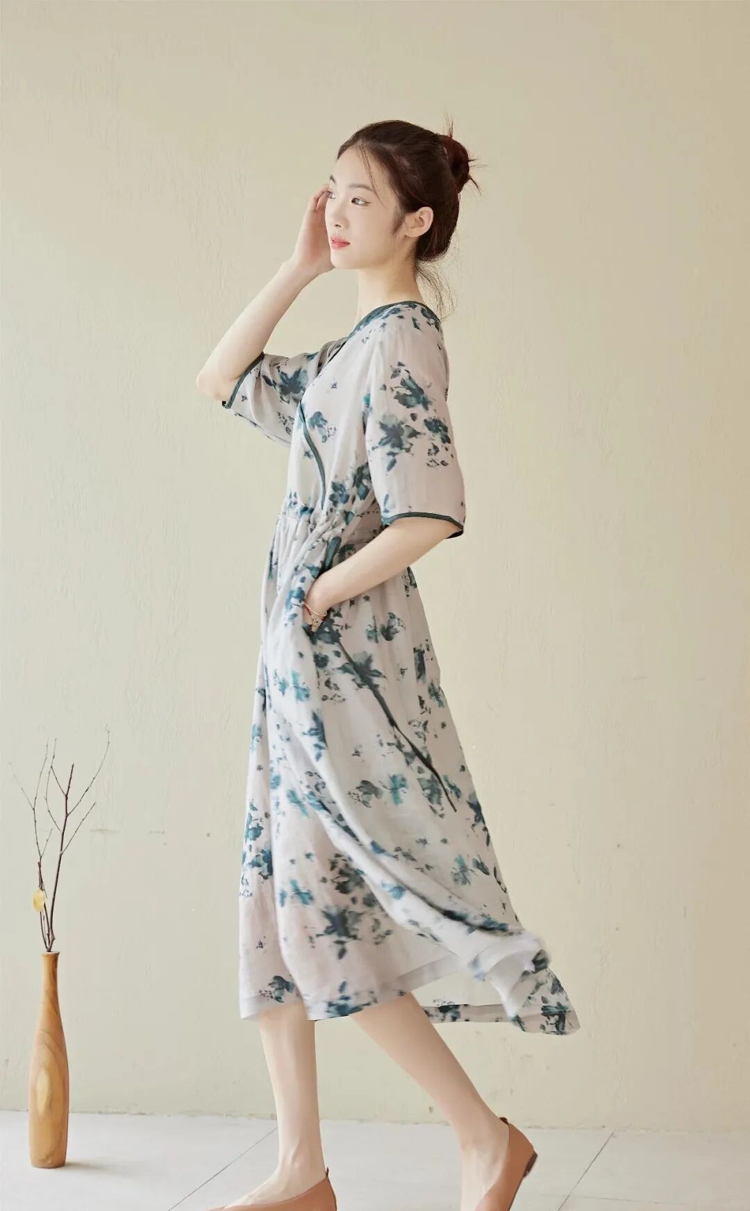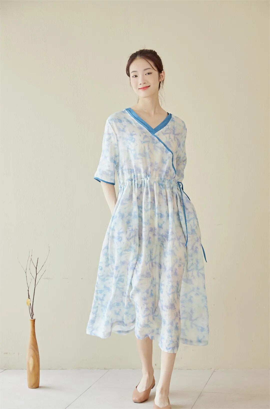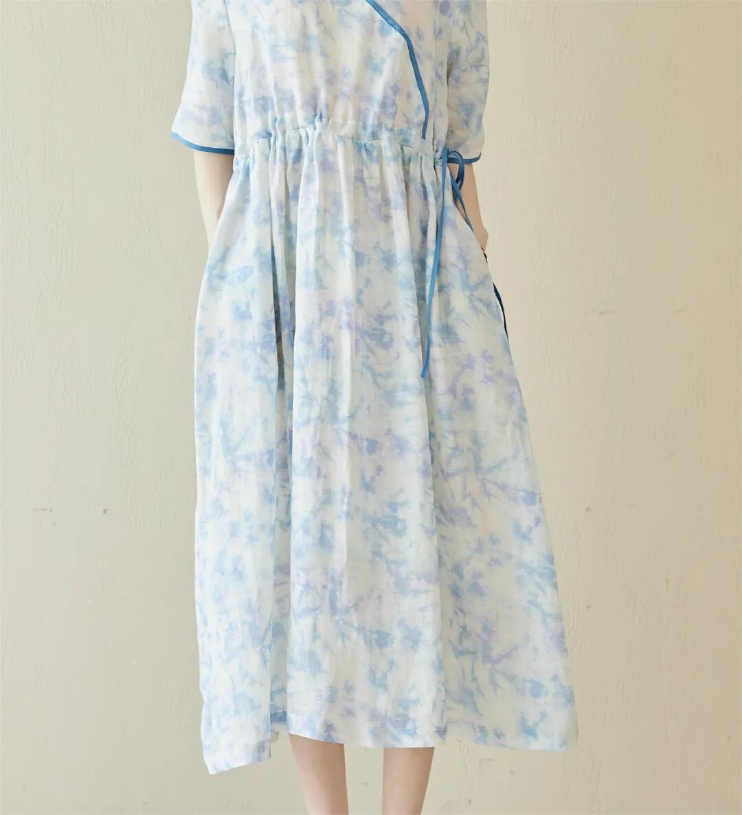 麻水墨扎染质感的印花亮眼独特,植物花卉充满生机,宽松藏肉,自在凉爽,印花清新雅致,摆脱了基础款的单调感。长短适中版型宽松,似绽于一片清风之中,夏天穿会刚刚好。腰间的抽绳设计,略高的位置,搭配较宽的裙摆,能瞬间提高腰线,优化身材比例,显高、显腿长细看抽绳,你会发现它是同材质撞色的,线迹细腻平整,质感高级。裙长到小腿中部,日常活动不易走光,优雅不压身高,还能挡太阳,不怕腿晒黑。V领斜襟的上半身,拼接同色系撞色为整体增加了线条感,能中和印花复杂的视觉感受,看起来更利落一些,整体做工也会偏复杂一些。会显得脖子的线条更加纤细优雅,也会显得更加轻盈、凉快宽松的中袖,能藏住拜拜肉,也增加了一丝温婉的气质,裙子两侧还配有口袋,方便你随身携带一些常用小物独特定制的印染花型,很好地打破大面积纯色的单调感,低饱和的配色,有细节感,又很不张扬,温柔清新。厚度偏轻薄,款式偏宽松,穿起来就像在身上罩了一层纱,舒服自在不闷热,再适合夏天不过了。