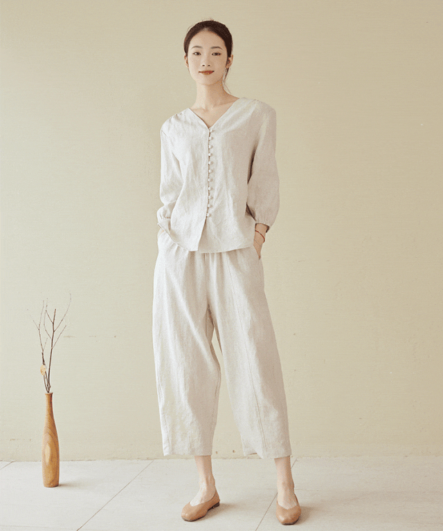 朴素的V领9分袖上衣,夏日的简约休闲单品。而在亚麻面料的表达之下,也渲染上了一层文艺的气息。恰到好处的V领可以露出锁骨,修饰脸型,穿脱起来方便自如,还很适合佩戴上一条项链。现代风格的剪裁,予你优雅姿态。宽松的直筒版型,添了几分雅韵,舒服而有型,将身形勾勒得轻盈显瘦,更显神清气爽门禁处是11颗纯手工定制包扣,线迹繁复细腻、错落有致,虽然做工复杂,却给衣服增添了一丝趣味,更显灵动,也为简约的上衣增添了一丝精致,穿起来既随意又大方。连身袖剪裁设计,能让肩线变得更优美流畅,从视觉上加强“收窄”身形的效果袖筒偏宽松,穿起来既舒服,又很好地藏起了手臂赘肉。袖口处微微抽褶设计,则起到了“收拢”效果,让手臂线条更显优美淡雅的原麻色,没有经过染色处理,保留原生亚麻纤维的米色,柔和干净,很清爽。藏青色,复古又雅致,透出一股质朴的文艺气息,沉稳素雅,利落百搭。制作很考究,细节精致,再加上高级的雨露麻面料,给人一种“穿衣讲究有品位”的感觉。出去室外不怕晒,进到空调房里不怕着凉,能从现在一直穿到入秋。这款亚麻九分裤,裤型直挺,结合中高腰设计,对不同身材都很友好。从膝盖到脚踝则微微收窄,从视觉上让小腿线条变得更纤细优美。长度大概是八九分的样子,能轻松的露出脚踝,适合搭配渔夫鞋还有各种凉鞋~无多余装饰的简约设计,用来搭配不同风格的上衣都很好看,不易出错。腰部松紧设计,内里有抽绳,包容性好,适合不同的身材,穿着舒适。合身流畅的腰臀部剪裁,起到了自然的遮胯宽效果,上身利落不臃肿。或许你会觉得有点贵,但考虑到它们100%亚麻的用料,匠人工艺及剪裁,其实它是值得的。