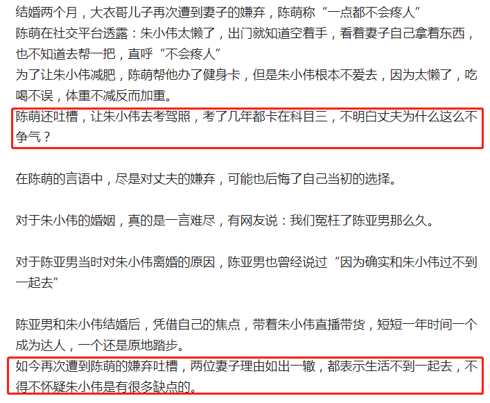 陈萌在微博中透露自己一个人无法支撑整个家庭,满是抱怨的言辞,仿佛想告诉大家,朱小伟多么的懒散,多么的无志向,简直就像一个只知道工作的工头,她怎么能忍受得了。