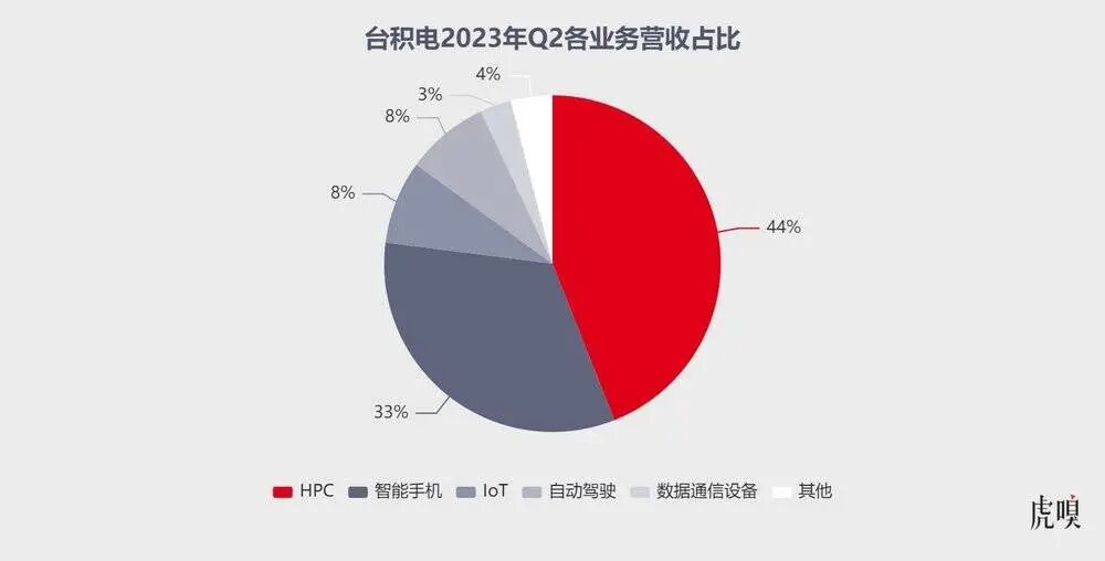 按照收入来源划分,二季度智能手机为台积电贡献了33%的营收,HPC(高性能计算)贡献了44%的营收,这个数字与一季度基本持平。如果按照一季度167亿美元的整体营收计算,二季度HPC创造的营收甚至比一季度还要低4.4亿美元。