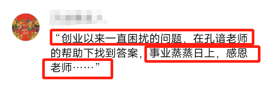 “创业以来一直困扰的问题,在孔谙老师的帮助下找到答案,事业蒸蒸日上,感恩老师……”