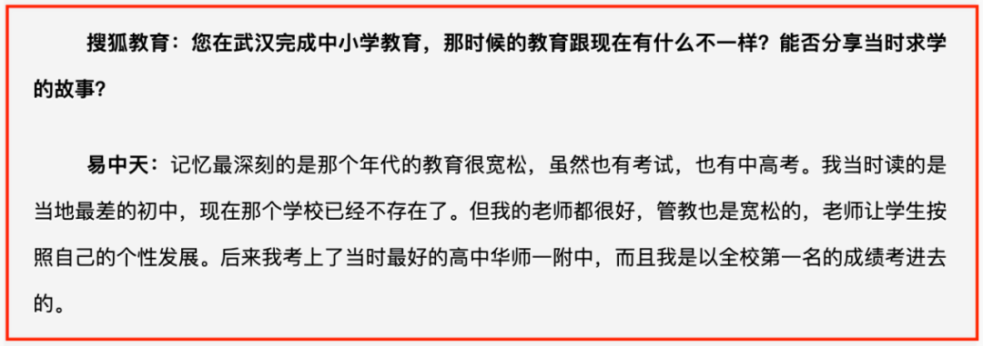 但由于父母强烈反对,易中天只能远离舞台,潜心学习,以全校第一的成绩,考入当地最好的高中,华师一附中。