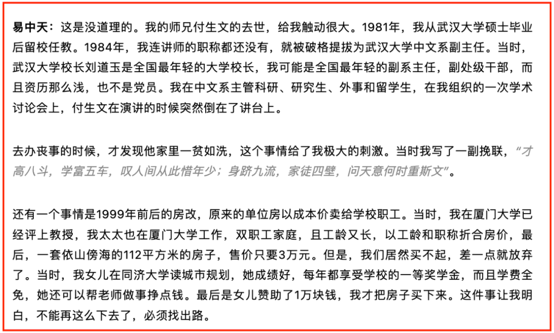 事后,易中天去探望其家人时发现,师兄虽然学术成就十分卓越,却家徒四壁,一贫如洗。