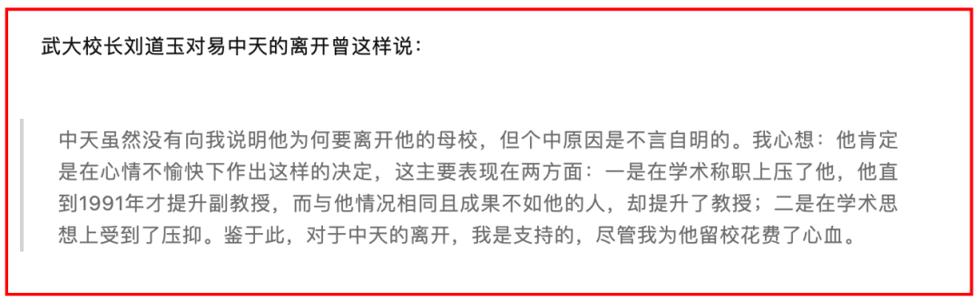 刘道玉曾对记者说,(易)中天虽然没有向我说明,他为何要离开他的母校,但个人原因是不言自明的。我心想:他肯定是在心情不愉快下作出这样的决定。