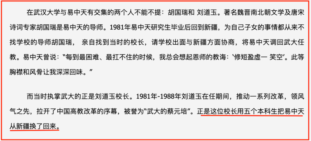 但在时任武大校长刘道玉和导师胡国瑞的努力下,最终用五个本科生,成功把易中天从新疆“换”了回来。