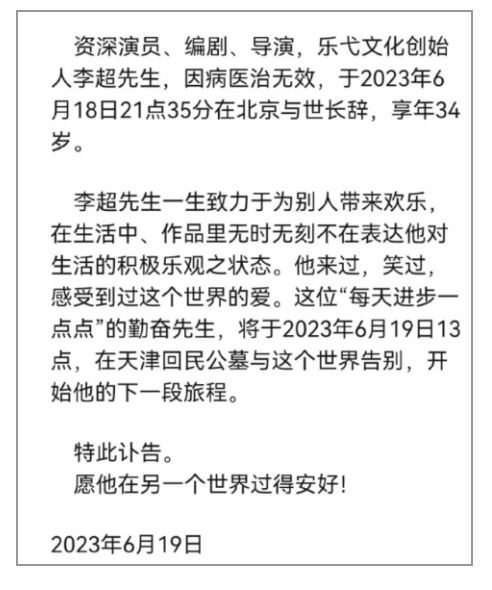 北京乐弋文化传媒有限公司发布讣告