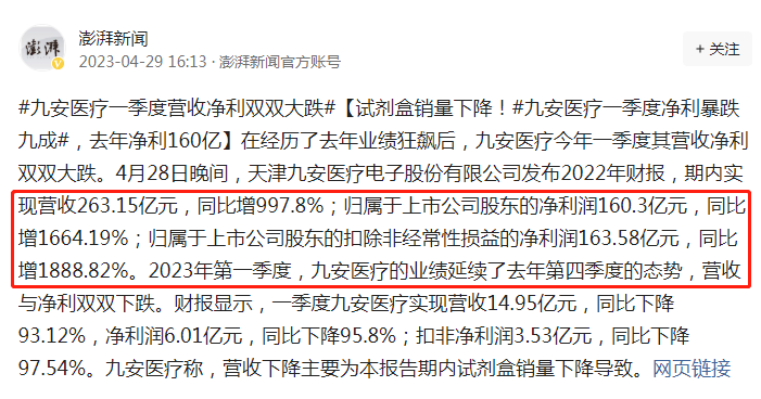 核酸检测行业龙头企业九源医疗在2022年实现了前所未有的盈利水平,净利润飙升至16.03亿元。这比上一年增长了惊人的17倍,超过历史赚钱的总和。