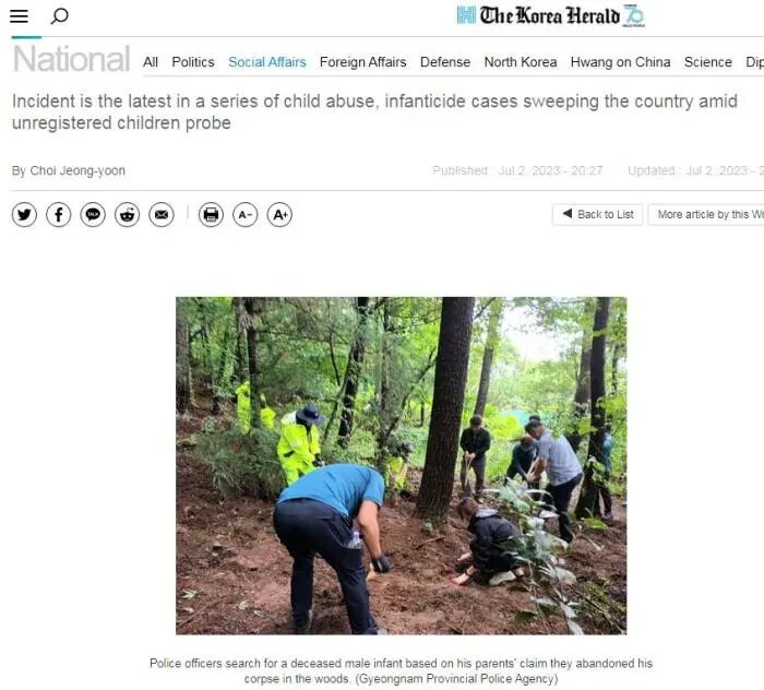 警方表示,这名孩子于2022年9月5日出生。这对夫妇最初声称,9月9日发现孩子死在家中,他们因为经济拮据负担不起火葬费,自己埋葬了孩子。韩媒称,在这对夫妇的罪行被披露前,当地政府发现该夫妇没有为婴儿进行出生登记,并向警方上报孩童失踪一事。随后,在警方的进一步调查中,男子承认自己勒死了婴儿,并试图把尸体埋在荒野中。目前,警方在海岸警卫队的协助下找到了婴儿尸体。《韩国先驱报》援引韩国监察院数据称,在2015年至2022年出生的婴儿中,共有2236人出生后没有登记。![]()