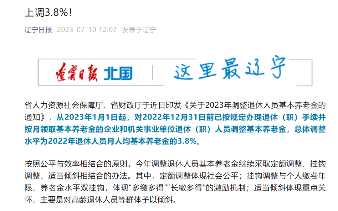 另外,辽宁的《通知》要求,各地要采取有力措施,确保在2023年7月31日前将增加的基本养老金发放到退休人员手中,不得发生拖欠。