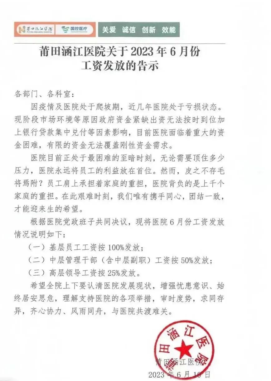 在涵江医院公开的一份6月份工资发放告示中,写明:“基层员工工资按100%发放”“中层管理干部(含中层副职)工资按50%发放”“高层领导工资按25%发放”。告示中还号召“全院上下风雨同舟,与医院共渡难关。”
