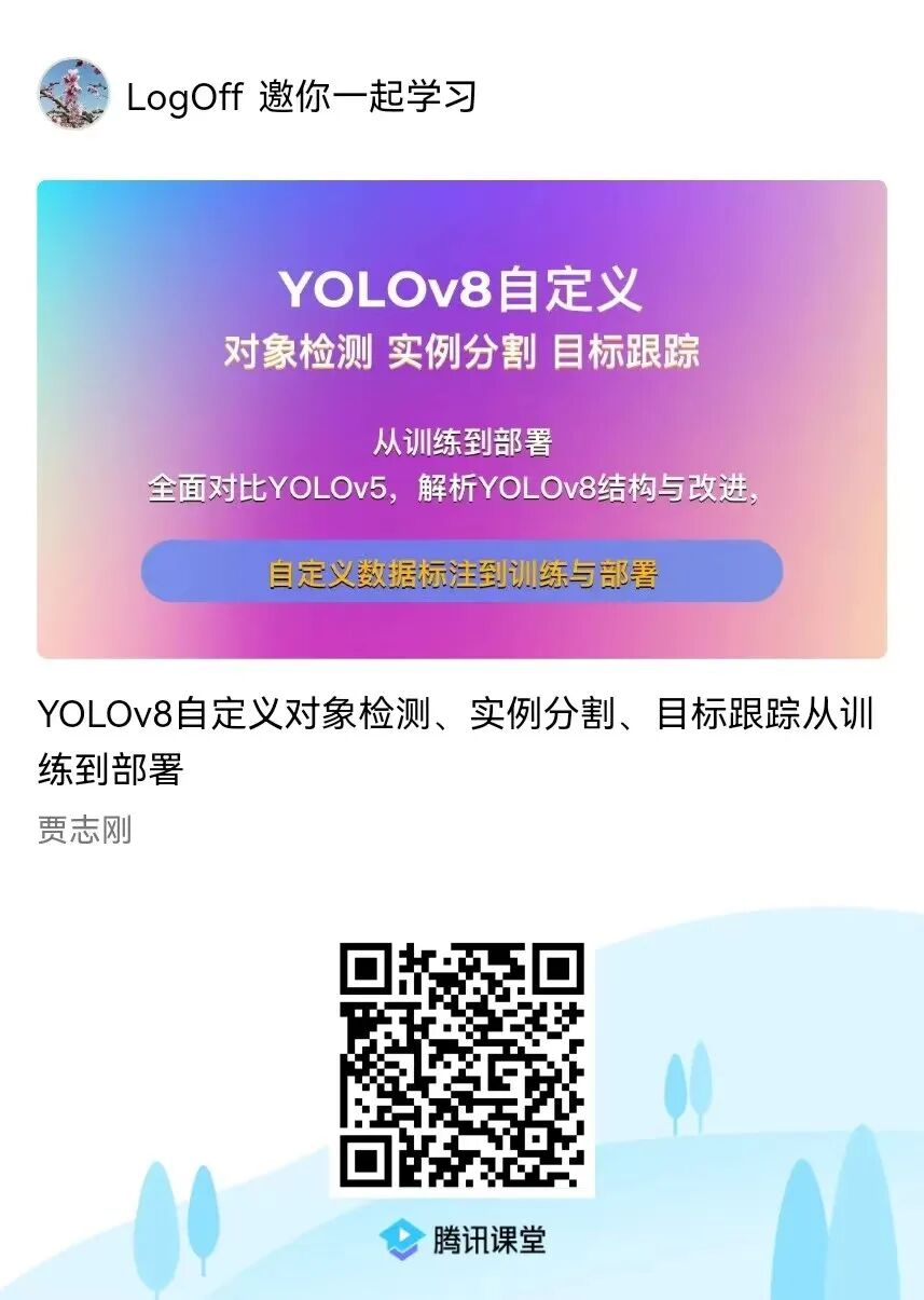 详解YOLOv8模型结构从Backone、Neck、Header、Loss层面全面对比YOLOv5,详解YOLOv8相比YOLOX、YOLOv5、YOLOv6的全面改进与创新。完成YOLOv8自定义数据的对象检测,实例分割、自定义对象跟踪,YOLOv8在主流推理平台上部署包括 OpenVINO、TensorRT 、ONNXRUNTIME、OpenCV DNN上推理代码详解与演示。打通从模型结构理论到工程实践训练部署整个流程。彻底理解与玩转YOLOv8。![]()