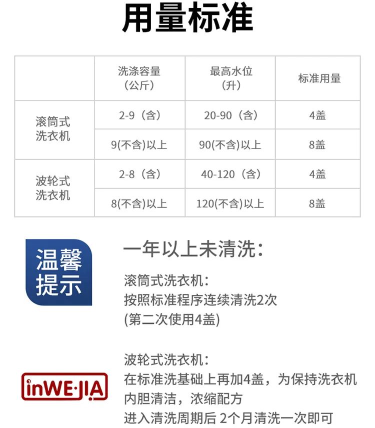洗衣机型号不同,用量也不同,具体用量大家可以参考一下官方提供的说明: