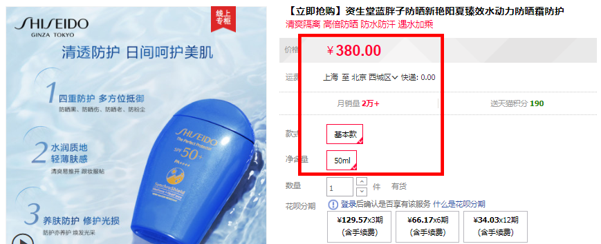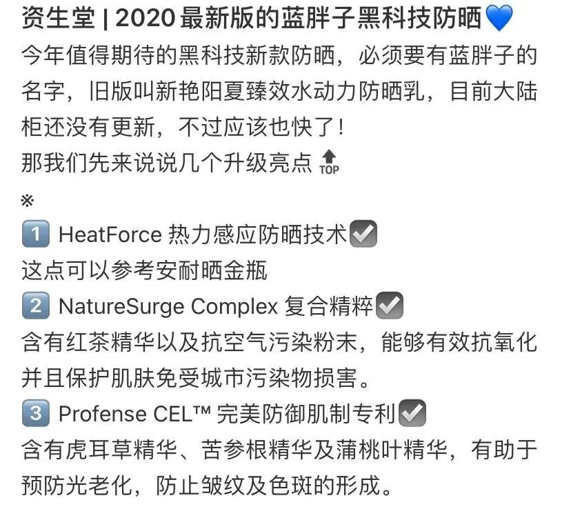 资生堂这个品牌就不用说了,创立于1872年,距今已有149年的历史。作为化妆品界三巨头之一,它在我们的生活中简直是“病毒式蔓延”。在防晒界,资生堂更是有口皆碑,基本比较出名的CPB、蓝胖子、欧珀莱、安耐晒等等都出自它的旗下。包括SUGI、堂吉诃德在内的3000多家药妆给到用户的反馈,蓝胖子好评高达98.7%!是所有防晒产品中得分高的。不仅深受博主、达人喜爱,笔记多达1W+,明星也爱种草!而今天我们带来的是新版蓝胖子,拥有黑科技wetforce+heatforce两大技术!遇水则强+遇热稳定,还从pa+++升级成pa++++。它的黑科技比金瓶更强,户外出行真的非常需要这样一款无惧紫外线的防晒产品!现在一款单独的蓝胖子防晒优惠价格是159元,蓝胖子防晒+安耐晒防晒喷雾只要199元,赶紧行动吧!-点击下图立即购买-