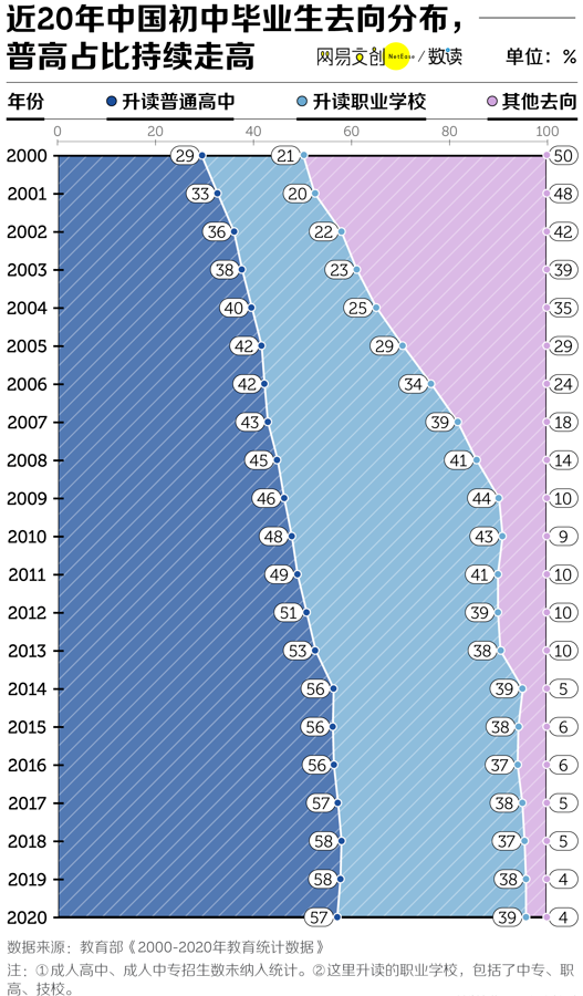 “推动职普协调发展”、“将对消解职普分流带来的教育焦虑有重大作用”,仔细品味新闻中的这句话。父母们也可以简单理解为,中考分流、职普协调发展,不仅不会取消,反而会更加坚定地执行下去。各地的中考录取比例可能会略有差别,但教育部曾经发过通知,要保持高中阶段教育职普比大体相当。也就是说一半孩子上不了普通高中,被分流去接受职业教育,会成为常态。以北京为例,很多中学已经在分流的压力下,劝一些成绩不太好的孩子放弃中考,直接去职业学校。网上还流传出了申请书的模板。而大家无论多么望子成龙,都有一半的父母要做好孩子可能没有普通高中学历的准备。在 20 年前,一个孩子没有高中学历,可能并不是一件让人难以接受的事情。根据《2000年—2022年教育统计数据》,我们国家的高中录取率总体录取率甚至是逐年在上升的,只是近两年也略有下降。在 2000 年,只有 29% 的孩子能顺利升入普通高中,21% 的孩子,都去读了职业学校。剩下的部分孩子,属于其他去向。其中相当多的一部分孩子,可能就是外出打工,或者辍学在家种地。等到十八九岁,准备嫁人、娶媳妇。而到了 2010 年,已经有 48% 的孩子能够升入普通高中,有 43% 的孩子能够接受职业教育。跟我们现在说的一半孩子能上高中,是差不多的。但是那个年代,似乎也并没有引起过多的讨论。2020 年,已经有 57% 的孩子可以读高中,39% 的孩子进入职业学校。从比例上看,越来越多的孩子可以进入高中学习,但是却有越来越多的父母感觉到难以接受、压力太大。这其实是跟我们的经济发展水平相关,只有少部分人能上高中的年代,大专、职高,甚至初中生只要肯干,都有一定的机会能被求职企业顺利录取。但是在今天,用人单位的门槛已经越来越高。薪资待遇、工作环境、就业门槛的差距,是让父母感到压力的重要原因。