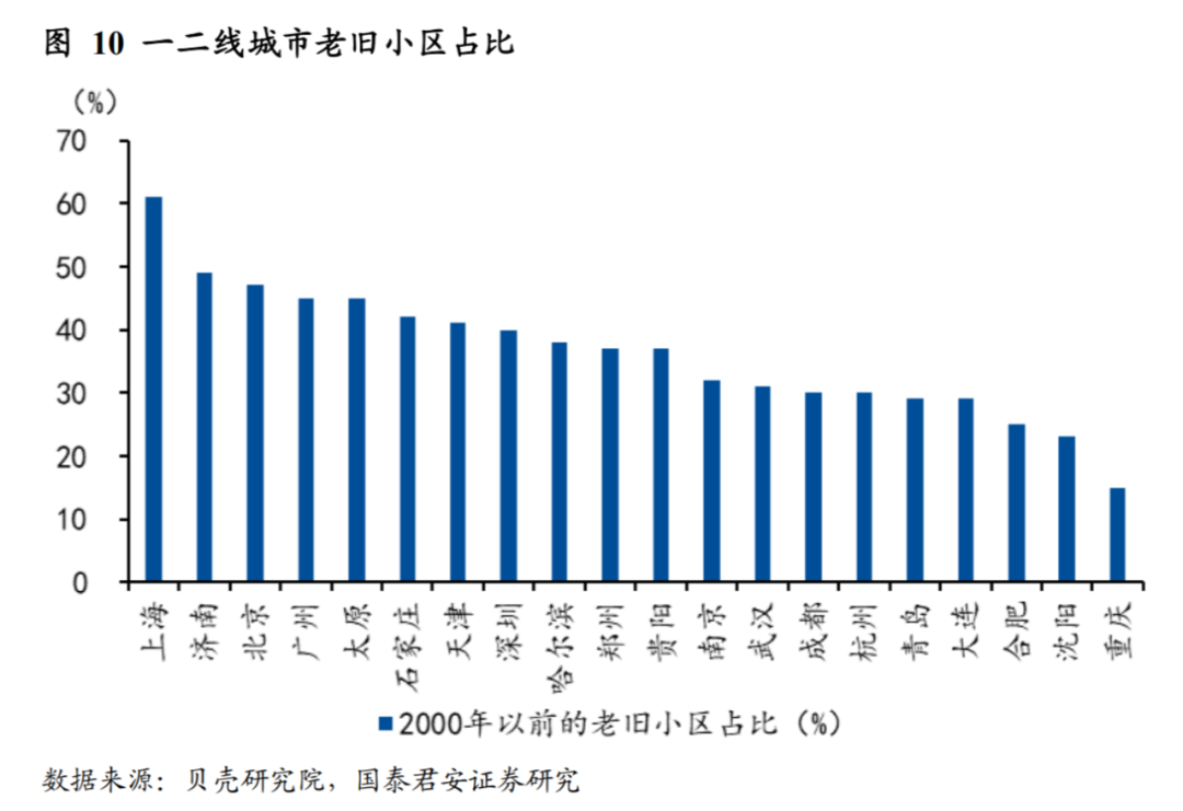 根据贝壳研究院的数据,大部分一二线城市2000年以前的老旧小区占比在20%-40%之间,我们取中间值30%。这块弹性比较大,如果以最小体量来估算, 则参照老旧小区改造,取中间值 为750 元每平米,如果是拆除重建,取中间值为3500元每平米。配套的家电家具成本,70平米的房子可以拉动1.5万元的家电消费: