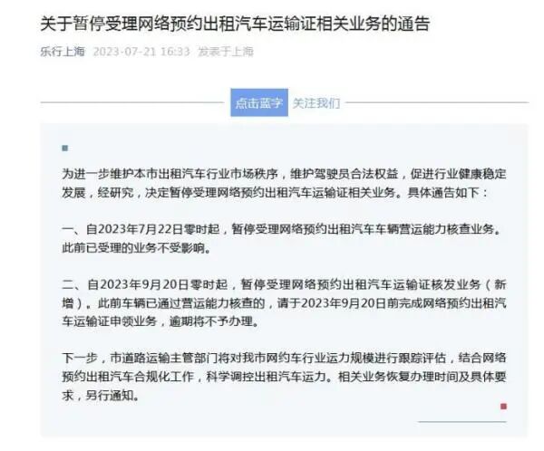 随着网约车市场日渐饱和,今年以来多个城市提出行业预警或者暂停受理以维护秩序。7月21日,上海市道路运输管理局发布通告称,自2023年7月22日零时起,暂停受理网络预约出租汽车车辆营运能力核查业务。此前已受理的业务不受影响。据上海市道路运输事业发展中心官方微信消息,上海市道路运输局21日发布《关于暂停受理网络预约出租汽车运输证相关业务的通告》(以下简称《通告》)。《通告》称,为进一步维护本市出租汽车行业市场秩序,维护驾驶员合法权益,促进行业健康稳定发展,经研究,决定暂停受理网络预约出租汽车运输证相关业务。《通告》提到,自2023年7月22日零时起,暂停受理网络预约出租汽车车辆营运能力核查业务。此前已受理的业务不受影响。自2023年9月20日零时起,暂停受理网络预约出租汽车运输证核发业务(新增)。此前车辆已通过营运能力核查的,请于2023年9月20日前完成网络预约出租汽车运输证申领业务,逾期将不予办理。《通告》还称,下一步,上海市道路运输主管部门将对上海市网约车行业运力规模进行跟踪评估,结合网络预约出租汽车合规化工作,科学调控出租汽车运力。相关业务恢复办理时间及具体要求,另行通知。![上海将暂停受理网络预约出租汽车运输证相关业务]()
