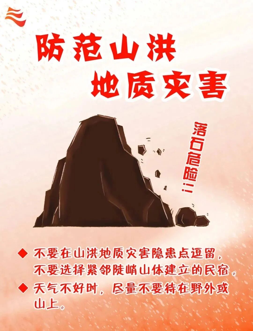 一、增强汛期防范意识。游玩途中及时关注天气变化及最新预报预警信息,警惕山体滑坡、落石、泥石流、山洪暴发等安全风险,及时调整出游行程,及时应急避险。二、增强消防安全意识。严格遵守消防安全管理规定,不在易燃物聚集地或有防火提示的地方吸烟、烧烤或者使用明火。入住宾馆饭店时,及时了解消防疏散通道,不躺卧在沙发上、床上吸烟。 三、增强文明出游意识。爱护文物古迹,保护生态环境,爱惜公共设施,遵守公共秩序,尊重当地文化传统、宗教信仰,践行文明旅游行为规范,弘扬文明旅游新风尚。四、注意防暑降温。高温天气期间,合理安排行程和旅游项目,避开或缩短户外旅游,科学调整休息时间。特殊情况下,听从工作人员的指挥和安排,做到有序疏散。