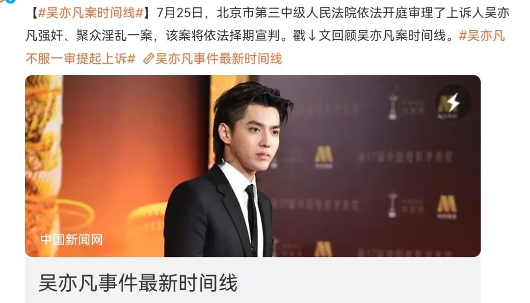 今天吴亦凡二审开庭了,锤爷带大家回忆下去年年底的一审判决结果,QJ罪、聚众Y乱罪数罪并罚,决定执行有期徒刑13年,附加驱逐出境。结果出来后他那边不服又提起上诉,至此开始就不断有人在拿他二审没判决的事来说,想方设法来证明他是被冤枉的,然后等到这次二审就可以推翻之前的判决了