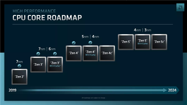 AMD当前的锐龙7000系列还是Zen4架构,再往后就是Zen5了,快的话今年底能发布,慢的话也是2024年上市,初期是4nm工艺,后期升级3nm工艺。