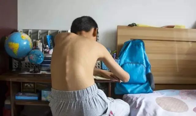 一个五年级的孩子在家写作业。家长说,由于作业多,孩子们写作业时很难长时间保持正确坐姿。孩子的脊柱小小年纪就变形的,有很多。