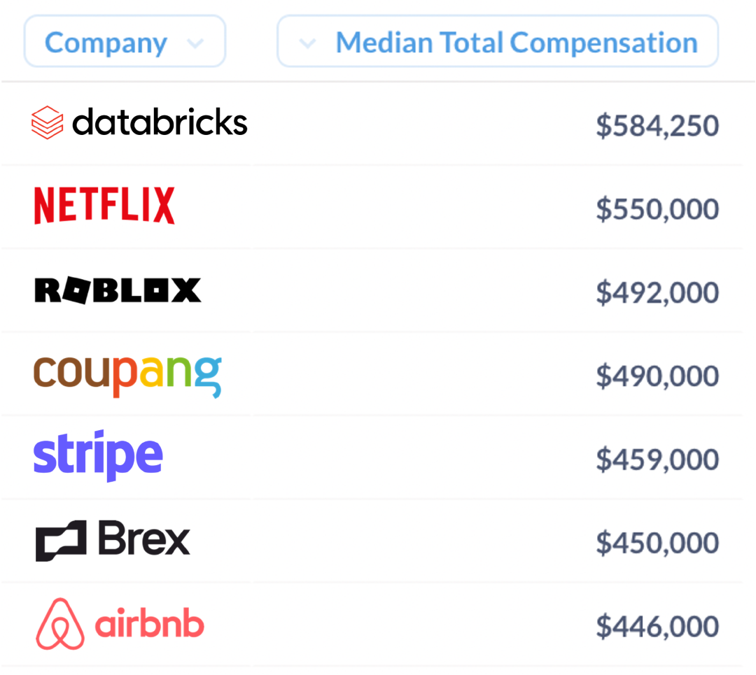 在高级工程师排名中,前三名的总薪酬中位数存在一定差异,分别是:Databricks 、 Netflix 、ROBLOX。