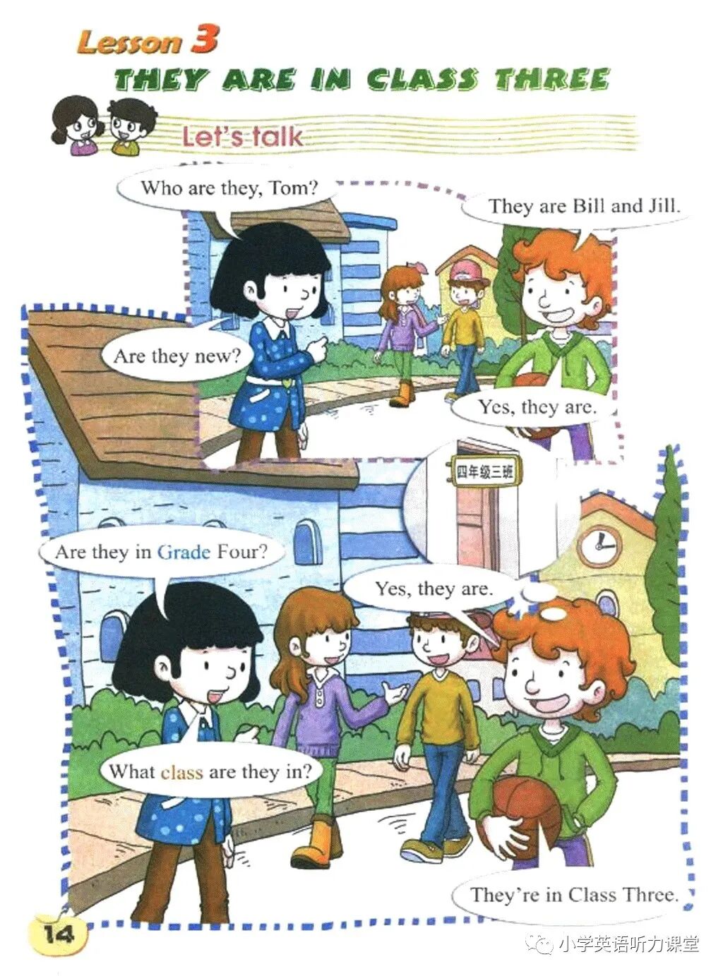 Lesson 3They are in Class Three第三课他们在三班Let's talk一起说Who are they, Tom?汤姆,他们是谁?They are Bill and Jill.他们是比尔和吉尔。Are they new?他们是新来的吗?Yes, they are.是的,他们是。Are they in Grade Four?他们在四年级吗?Yes, they are.是的,他们是。What class are they in?他们在哪个班?They're in Class Three.他们在三班。Let's learn大家一起学习Are they in Grade Four?他们在四年级吗?Yes, they are.是的,他们是。What class are they in?他们在哪个班?They are in Class Two.他们在二班。Grade Four 四年级Class Two二班Grade One 一年级Class One一班Grade Three 三年级Class Four四班Grade Two 二年级Class Three三班Let's sing一起唱歌Are you in Class One?《你们在一班吗?》Are you in Class One?No, we are not.What class are you in?We're in Class Two.你在一班吗?不,我们不在。你们在哪个班?我们在二班。Are they in Grade Three?No, they are not.What grade are they in?They're in Grade Four.他们在三年级吗?不,他们不在。他们在几年级?他们在四年级。Listen and tick听录音,选正确答案。1.I’m in Class 4.我在四班。2.Eve is in the car.伊芙在车里。3.Dongdong’s trousers are brown.东东的裤子是棕色的。4.Qiqi is in the box.奇奇在盒子里。5.Whose watch is this?这是谁的表?6.What’s the time? It’s ten.几点了? 十点了。