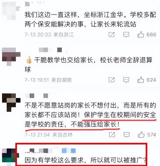 学校要是能采取自愿方式,协调好家长的时间,或许家长也不会如此气愤。有的学校强制家长轮流站岗,把轮岗表直接摆在学生面前,表示不能缺岗,就算请假也要来站岗。家长担心自己缺勤,学生会受到影响,只能在网上吐槽。