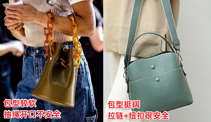 不过传统的水桶包都是圆柱形、抽绳缩口设计的,基本没法系紧;平时通勤挤公交地铁开口敞着很容易丢东西。