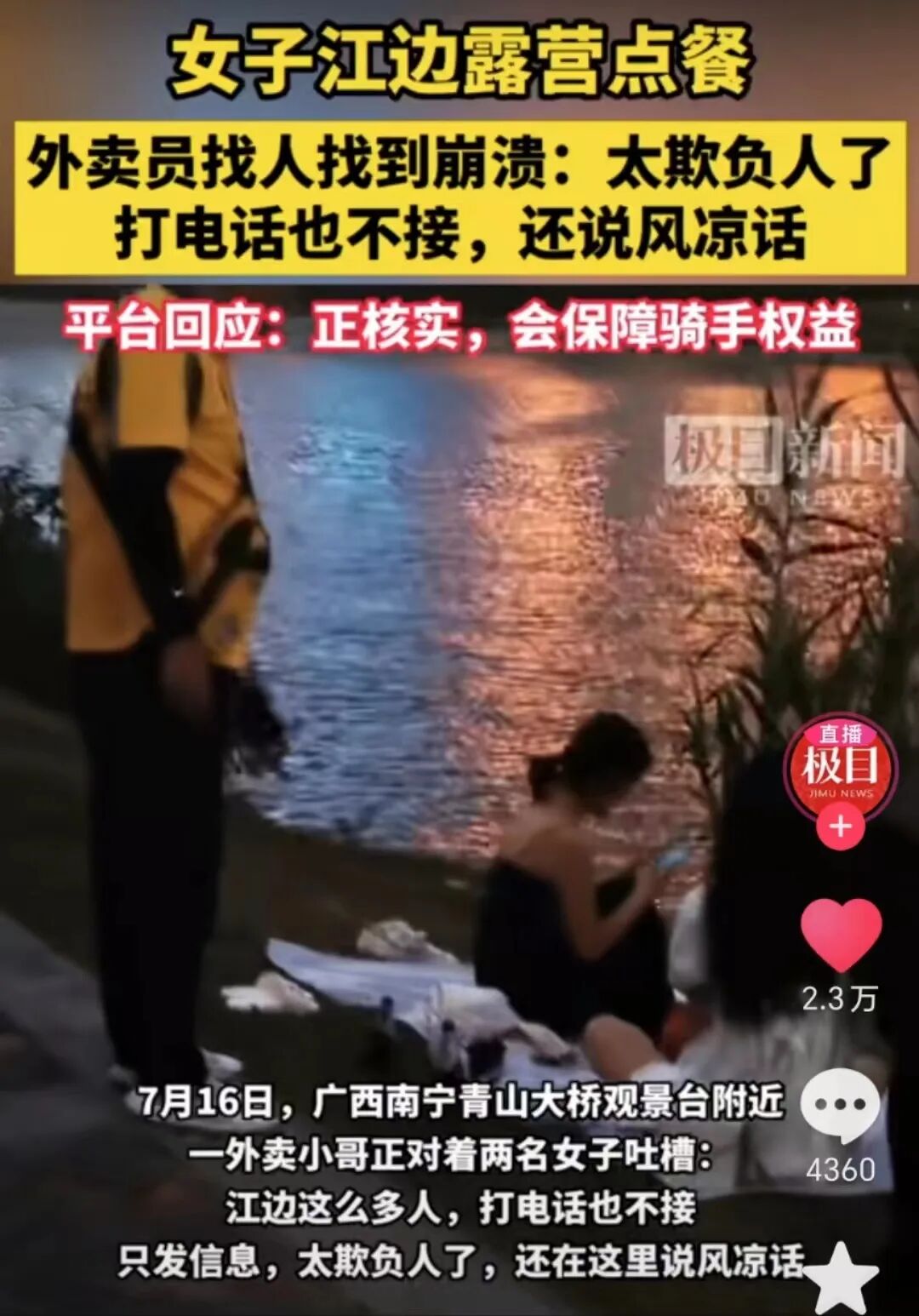两名在江边露营的女子,用手机点了外卖,送餐位置就定位在了江边。可到了江边之后,外卖小哥发现订单上面并没有备注具体的标志性建筑物信息。江边这么大,人又这么多,想要在这里找到订餐人跟“大江捞针”又有什么区别?看着即将超时的订单,外卖小哥彻底没辙了,只好沿着江边寻找。外卖小哥本以为订餐人是遇到了什么事不方便接电话,结果让他看到的却是这样一幕——只见她们坐在江边说说笑笑,手机就在手上拿着!一副好不惬意的模样!外卖小哥看到这一幕,虽然心里感到委屈,但也都忍了下来。然而,就在他正要离开赶去送下一单的时候,订餐的两名女子却是不依不饶,抱怨他送单不及时。这一刻,外卖小哥彻底崩溃了,将自己的委屈全部诉说了出来:“你们(地址)定个江边,江边那么大,那么多人,打电话不接,我上哪找人去?我从江头找到江尾,你们还说风凉话,哪有这么欺负人的?![]()