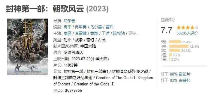 而最让人关注的影片品质,其实也是合格的。可以看到,在《封神第一部》正式公映前片方就颇为自信地发起多日点映。目前豆瓣7.7、猫眼9.4、淘票票9.2的评分,无论在国产奇幻电影领域还是整个国产电影维度下都属于中上水准。