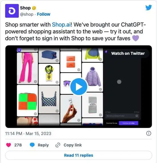 今年 3 月,Shopify 将 ChatGPT 助手添加到商店应用程序和网站中。Shopify 认为与 ChatGPT 结合的智能客服,可以超越上一代个性化问答,解决传统客服响应速率慢、人工成本高的痛点,降低运营成本。