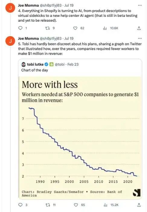 拥抱 AI 技术的同时,Tobi Lütke 在 Twitter 上曾公开表达了其基本思路:公司可以用更少的员工创造更高的收入,希望借此削减成本来取悦各位股东。