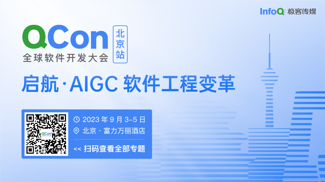 以「启航·AIGC 软件工程变革」为主题的 QCon 全球软件开发大会·北京站将于 9 月 3-5 日在北京•富力万丽酒店举办,此次大会策划了面向 AI 的存储、AIGC 浪潮下的研发效能提升、大前端融合提效、大模型应用落地、LLMOps、异构算力、微服务架构治理、业务安全技术、构建未来软件的编程语言、FinOps 等近 30 个精彩专题。