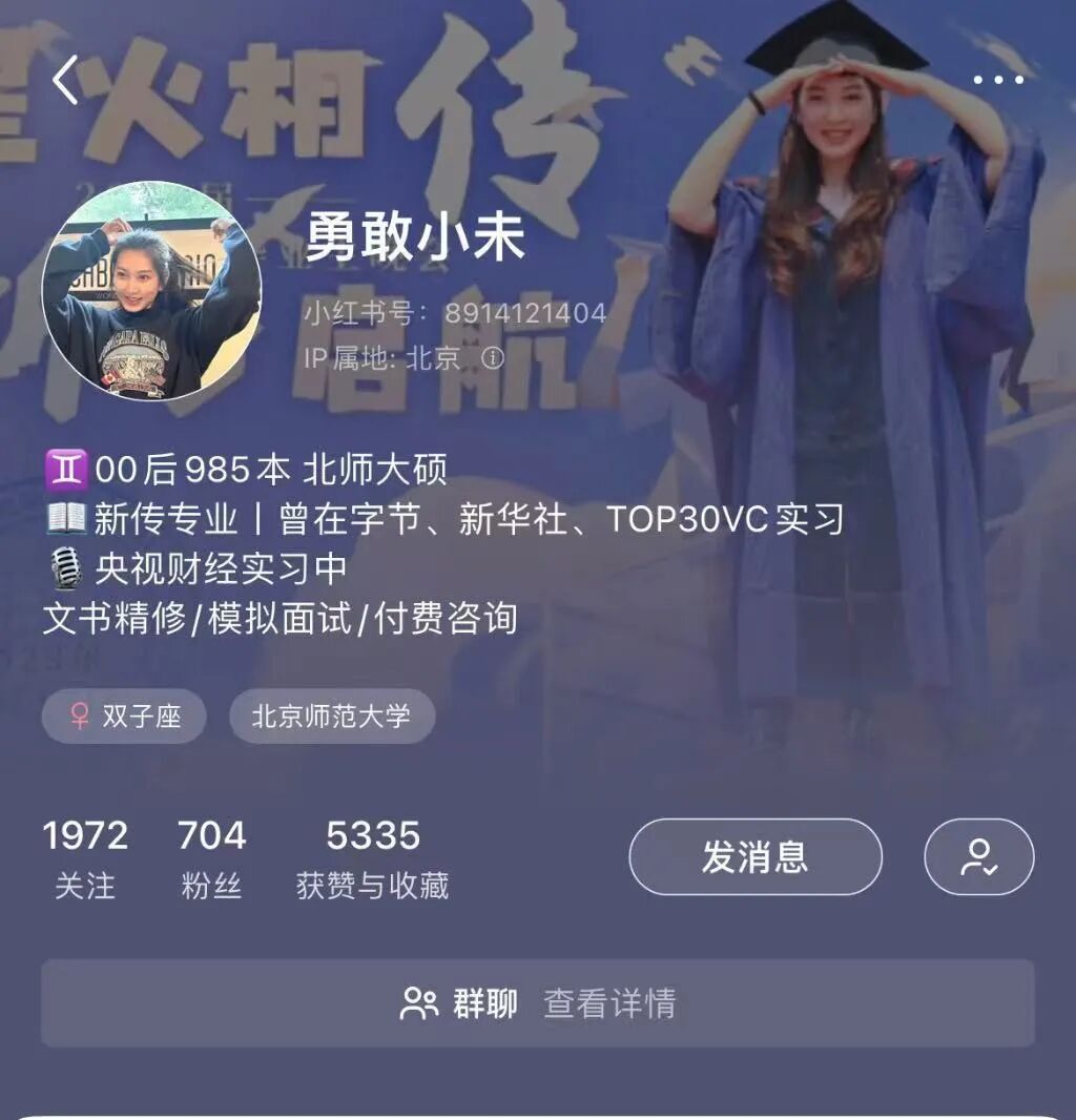 卷实习的大学生,制造出一门生意小未更看重在实习中个人能力的提升,并非是走马观花式的体验,“四个月以上”和“线下实习”是她实习的基本准则。小未表示,现在把自己放进任何新的工作环境中,只需要一周时间,她便可以熟悉整个工作流程。“在这么多段实习后,我从ISFJ变成了ISTJ,大家都说我不像双子座了,更像稳重的金牛座。”除了在工作中对自身的打磨和雕琢,实习也在悄然改变着小未的性格。如果说小未的前几段大厂实习,是为了“拓眼界”,那么小未现在对于实习的选择,则是在“做减法”。结合自己的专业,小未在实习中愈发明确自己感兴趣的领域。她的硕士研究方向是风险传播,于是她在2023年1月开启了一段在VC行业的实习。相比于互联网大厂,她更喜欢媒体工作,所以在6月选择来到央视财经栏目。“趁年轻,多尝试,开拓视野和眼界,不害怕走弯路”,这是小未“卷”实习的初衷。小未在实习中不断成长的同时,还强烈地感受到人际关系对于获取实习机会的重要性。她能顺利地拿到滴滴、字节跳动的实习offer,是经由朋友内推或介绍,但是并非所有人都像小未这般幸运。对缺少实习资源的大学生来说,迈进大厂的门槛难免要经历一番波折,而他们必须得到这些机会,才在实习内卷中脱颖而出。小未逐渐意识到:实习内推,是一场交换。用自己个人口碑和职场信誉,既可以为别人换来一个在更高平台上实习的机会,也能为自己换来一笔可观的收入。于是她瞄准了这门生意,与有同样想法的朋友一拍即合,一起开创了一个为大学生求职、留学、保研全方位赋能的工作室。小未将个人小红书账号作为销售的前端,发布实习Vlog、保研分享等内容,再将其下沉至私域,在微信平台完成产品的销售。“大概每五个人中有一个会愿意付费咨询,每次咨询的收入是200元左右。”小未还会将工作室的公众号FutureClub推荐给学员,并搭建微信群聊在其中分享实习机会、专业笔记等等。