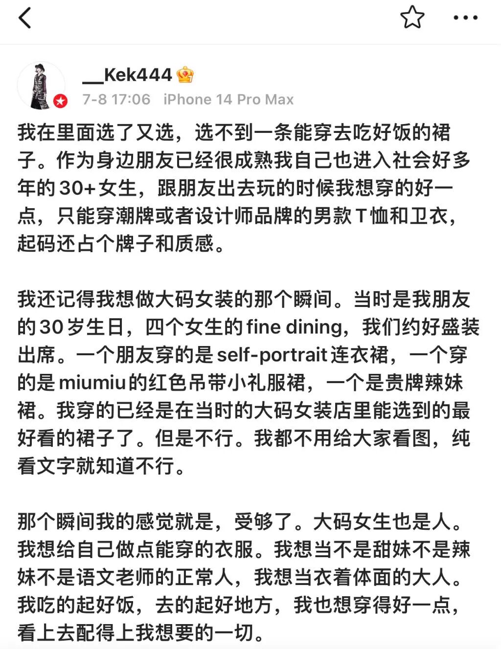 一直穿大码,网购13年,常和粉丝讨论大码女装,也在做测评——郭郭放眼望去整片大码女装市场,还是有鱼龙混杂的感觉:“一些大码店铺做了将近10年,能看得出是在反思、迭代;但也有一些比较头部的大码店,面料质量越来越差,有点‘飘了’;还有一些知名的品牌,质量可能不错,但版型也是一言难尽。”“现在做大码服装,你去拿二手三手货或者直接到工厂放码,都不是长久之计。除非是有自己的打版师和生产链,不然做大码终究会被市场淘汰。”作为大码女装的资深消费者和意见领袖,郭郭这样预测未来的市场走向。原本希望直播和电商能够弥合大码女性和市场的嫌隙,但在五光十色的直播间和图文中,大码女性始终没有得到满意的答案。面对风格滞后、槽点满满的大码女装市场,忍无可忍的消费者克克,决定创建自己的大码服装品牌,一年之后,她却这样说:“做大码,你只要看这个行业里的头部怎么做的,跟着他就行了,头部绝对不是傻子,如果他们不听用户的,那一定是因为我们用户说错了。”