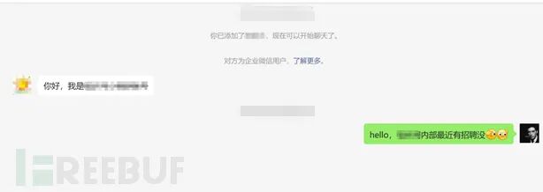 于是躺平了一天后我继续寻找猎物。第二天中午,我在目标网站的招聘模块顶部发现了一个微小的二维码。我立即扫描添加,并在下午成功通过了微信验证。这让我心中升起一股胜利的喜悦,毕竟这是钓鱼中的一次重要进展。