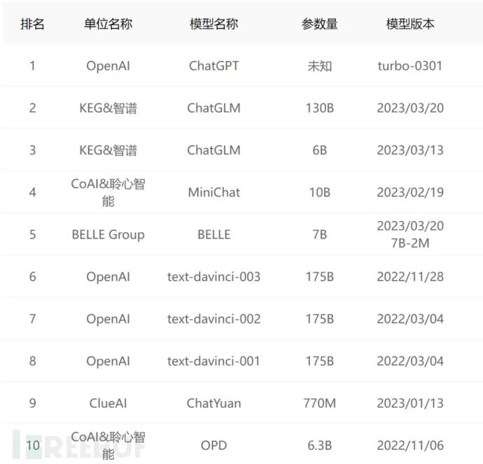 在目前进行安全性测试的AI大模型里,排名前十如下图所示: