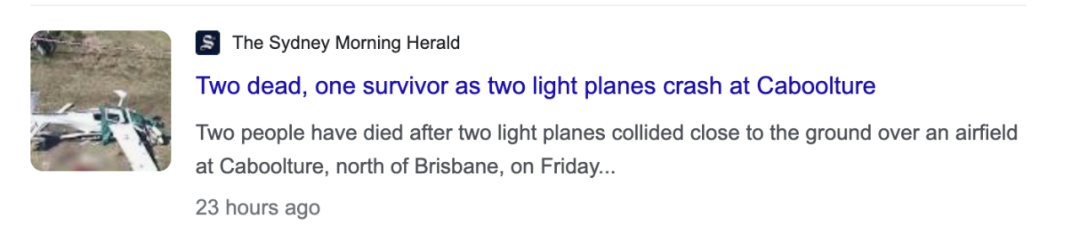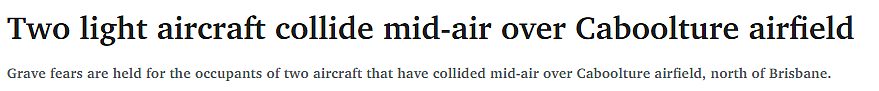 据《信使邮报》报道,就在昨天上午10点40分左右,布里斯班北部的Caboolture机场发生一起飞机碰撞事故,两架轻型飞机在机场上空相撞。