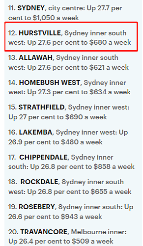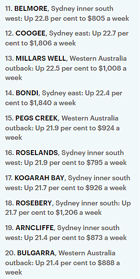 在租金涨幅最大的前20个城区中,悉尼占到了19个,它们都位于内城区,或是靠近海滩和CBD的邮编区。