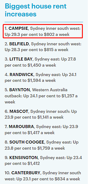而悉尼内南西区的华人区Campsie,则是独立屋租金涨幅最大的城区,增长了29.3%,中位数租金达到每周802澳元。