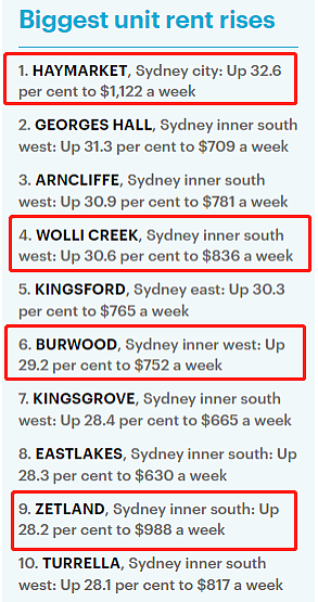 在截至今年6月的一年里,单元房租金涨幅最大的是靠近悉尼中央车站(Central Station)和唐人街的华人区Haymarket,达到了32.6%,租金中位数达到了每周1122澳元。