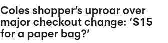 然而,Coles的一位发言人表示,该超市会坚定地支持其新推出的15澳元纸袋,声称这种纸袋具有“更长的使用寿命”,并且可以承载20公斤的重量。该发言人称:“我们的可清洗纸袋,由FSC认证的纸张制成,最近在店内推出,作为顾客购物时的另一种选择。”“15澳元的售价是基于多个因素确定的,包括所使用的材料,以及其能否机洗。”![]()