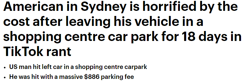 《每日邮报》7月26日报道,一名美国人将车停在悉尼一家购物中心两个多星期,被收取886澳元的停车费,他对此深感不满,并在抖音(TikTok)发视频吐槽。