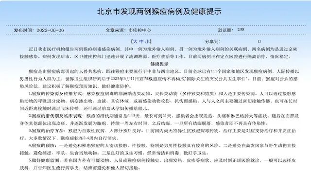 6月6日晚间,北京疾控发布消息称,近日北京市医疗机构报告两例猴痘病毒感染病例,其中一例为境外输入病例,另一例为境外输入病例的关联病例,两名病例均是通过亲密接触感染。病例发现后市、区卫健疾控部门迅速开展了流调溯源、医疗救治等工作。目前两病例正在定点医院进行隔离治疗,情况稳定。