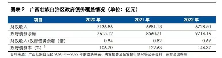 东方金诚对广西政府债券的信用评级报告数据显示,2022年广西政府债务率(不含隐性债务)为144.37%,2022年广西财政收入对政府债务覆盖倍数为0.69倍。财政收入可以覆盖较大部分政府债务,债务偿还期限分布较为合理,当地偿债能力极强,总体债务风险可控。