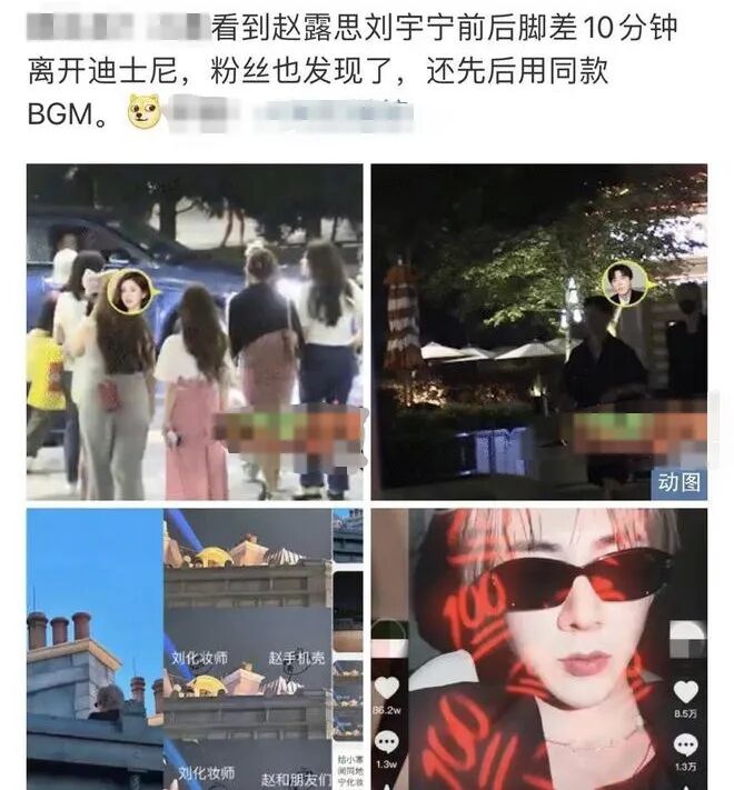 今天有狗仔放出赵露思和刘宇宁的内容,然后配文称两人前后脚差10分钟离开迪士尼,另外还被粉丝发现先后使用了同款BGM,紧接着又有其他狗仔在评论区@刘宇宁让他直播解释一下。发这种内容,可以看出明显是有往两人有绯闻方向引导,但又因为没有实锤就故意在文案上做点动作。