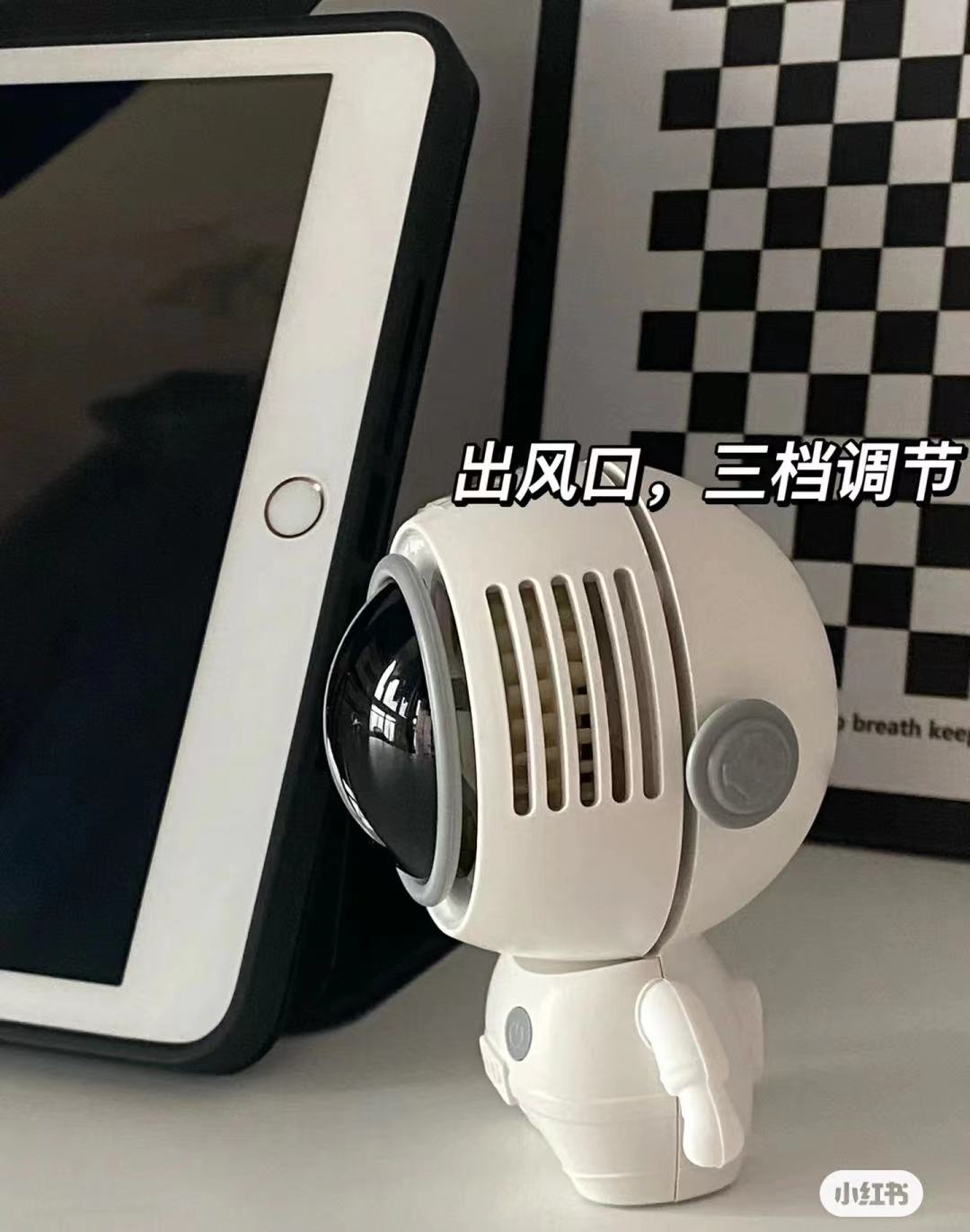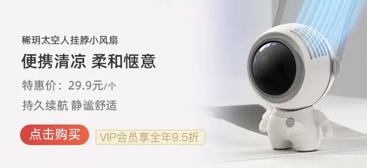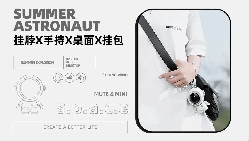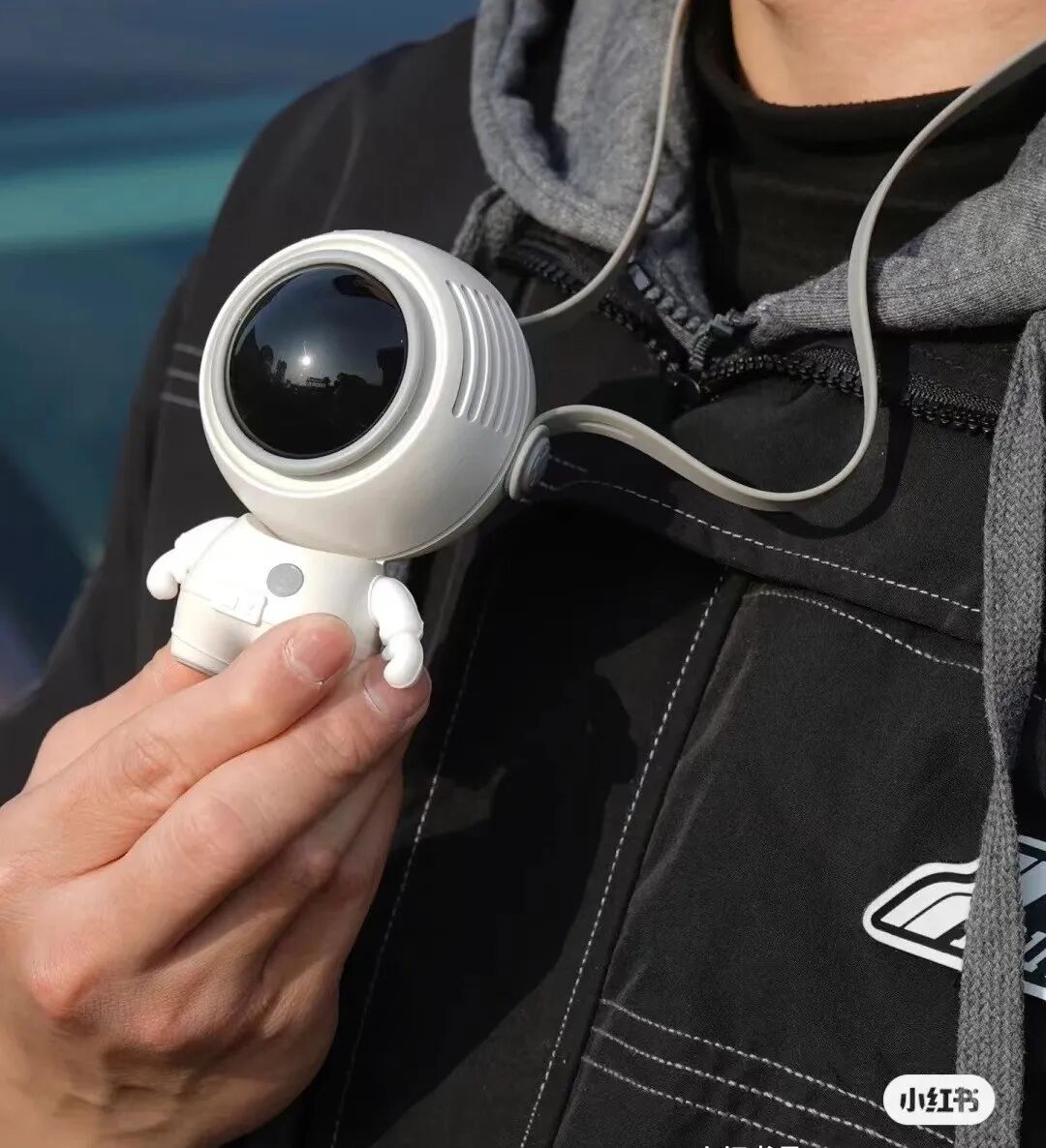 虽然写字楼、商场的中央空调已经可以开始使用了,但走在路上也没办法随时进去吹空调!真的是走路五分钟,身上都湿了,更别说脸上精致的妆容和卷好的发型。恨不得在自己身上装个移动空凋,随时制冷,清清凉凉。拥有一个小风扇就拥有了路人羡慕的目光,走在路上再也不怕大汗淋漓了。但是顶着炎炎夏日,戴着口罩,没有风扇,整个人都快被热化掉了。幸好还有一种挂脖式小风扇,可以直接挂在脖子上吹风,这简直就是懒人的福音!为了找到实用好看的一款,看了市面上的很多挂脖小风扇。最终选择了这款,而且也是颜值很高的一款——太空人挂脖式小风扇。挂脖设计,解放双手;