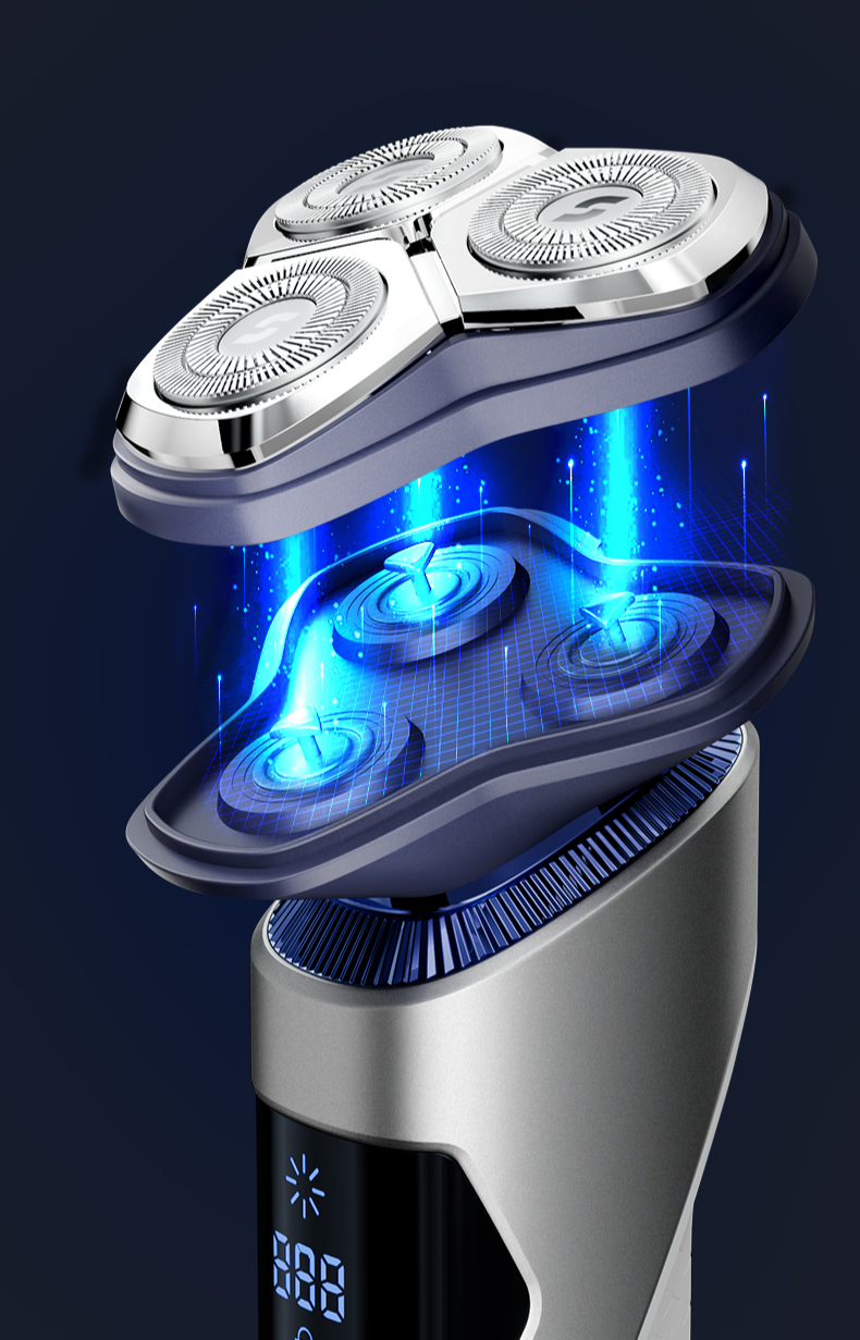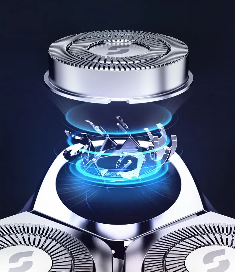 品质电动剃须刀标志性的【 360 度三网弧面浮动刀头】和【精工刀片】。
