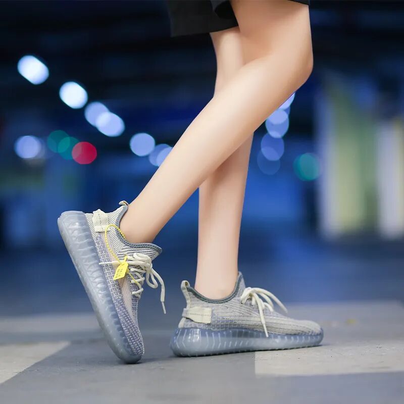 浅灰色鞋身耐脏又耐看,搭配黄蓝撞色的鞋底,个性十足,男女通穿。